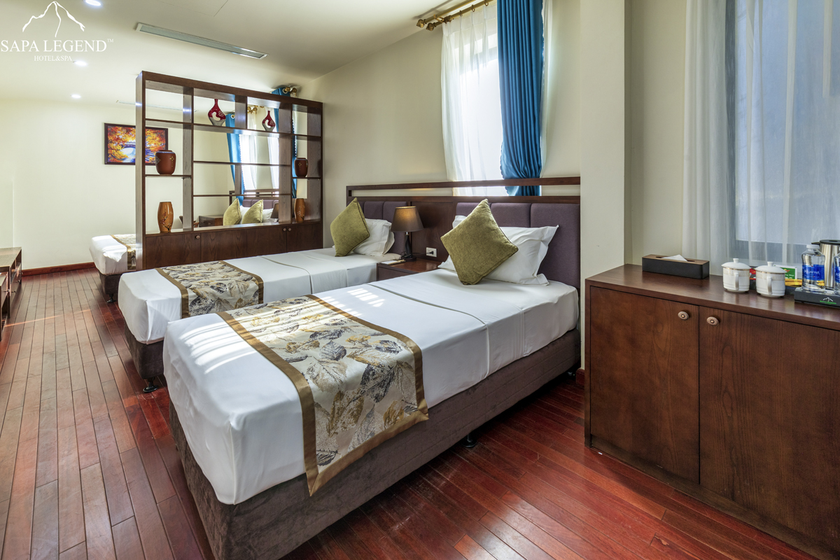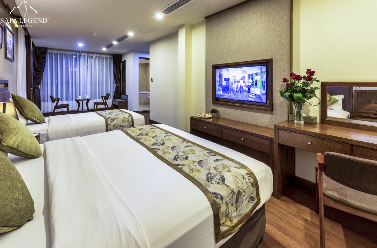 Sở hữu diện tích lên đến 65m2, Deluxe Queen Twin của Sapa Legend Hotel & Spa được thiết kế ấn tượng với ban công rộng nhìn ra phố và hồ, là căn phòng lý tưởng để tận hưởng vẻ đẹp thiên nhiên ngay vị trí trung tâm thị trấn Sapa. Tất cả hứa hẹn mang đến cho du khách không gian lý tưởng để thư giãn sau ngày dài tham quan, mua sắm tại thị trấn Sapa xinh đẹp.